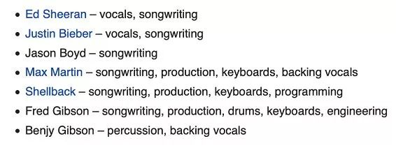 以上是英国创作歌手Ed Sheeran与加拿大歌手Justin Bieber合作的单曲I don't care的部分制作信息。从这里我们可以很清楚地看到这首歌制作的分工,其中很显眼的一个词就是songwriting了,翻译过来就是写歌。