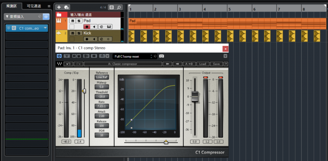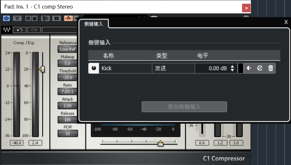 而我们的“侧链压缩”,顾名思义,是不是就是压缩侧边的音轨呢?其实不然。侧链压缩的对象事实上还是压缩器所在的这条音轨,只是其检测的电平信号的来源是“侧边”的轨道。