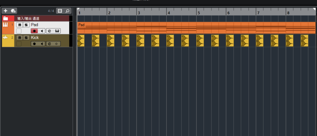 我们首先创建两条轨道,一条Pad音色轨,一条底鼓也就是Kick轨。说明一下,电子音乐抽吸效果的监测信号源一般都是底鼓所在的轨道,这也是为了让底鼓出来的时候能被人听清。