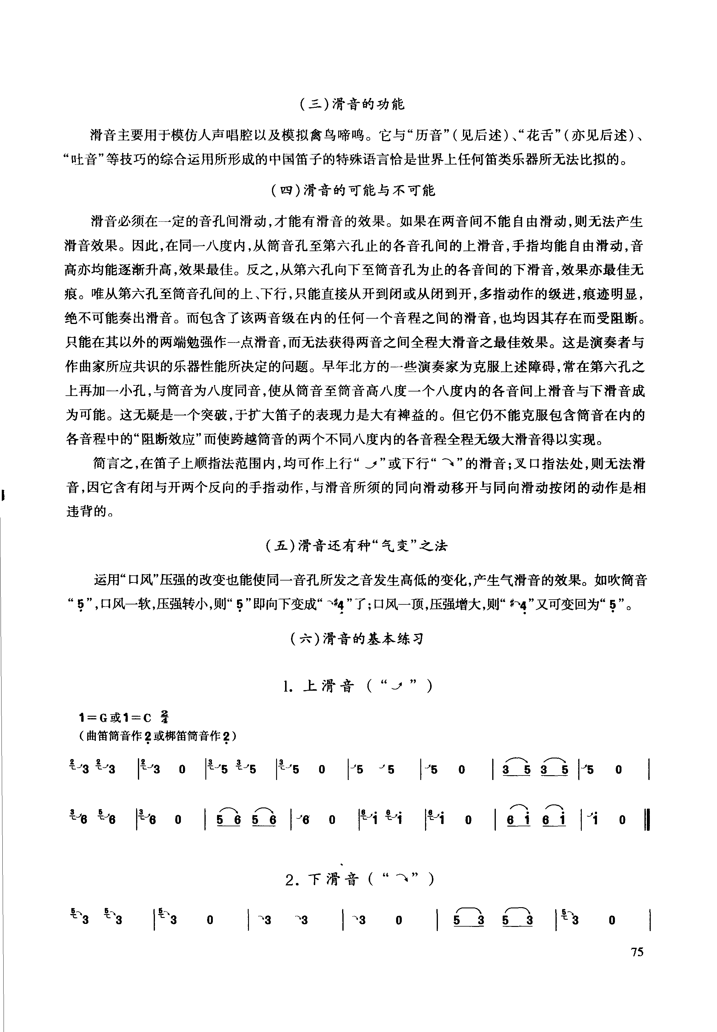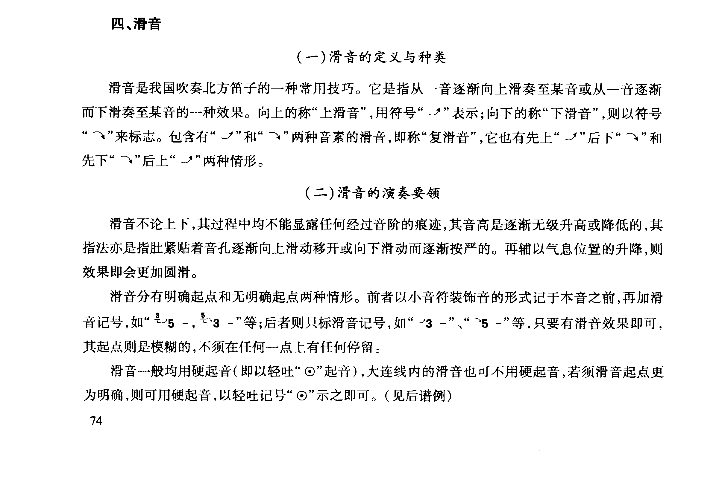 佚名 网络滑音是我国吹奏北方笛子的--种常用技巧。它是指从一音逐渐向上滑奏至某音或从一音逐渐而下滑奏至某音的---种效果。向上的称“上滑音”,用符号“”表示;向下的称“下滑音”,则以符号“"来标志。包含有“”和“"两种音素的滑音,即称“复滑音”,它也有先上“”后下“→”和先下“”后上“”两种情形。