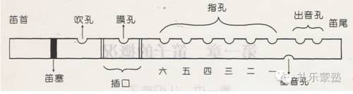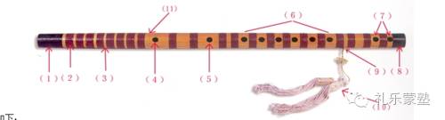 (1)前镶口(2)缠丝(3)海底(4)吹孔(5)膜孔(6)音孔(7)基音孔(8)后镶口(9)助音孔(10)飘穗(11)笛塞
