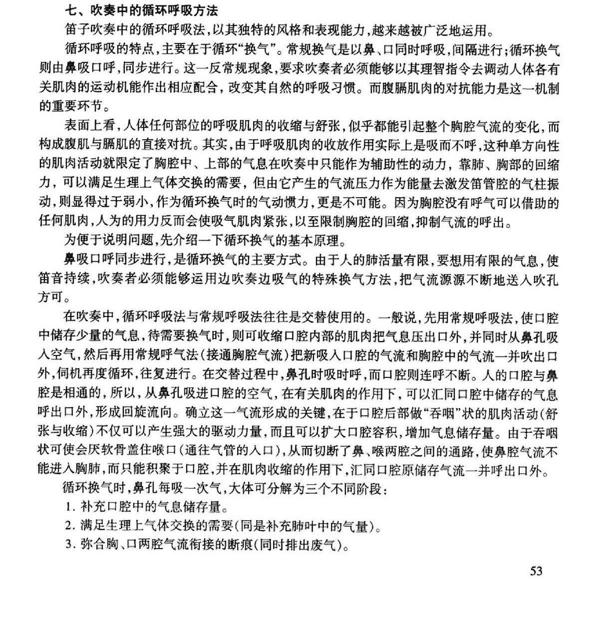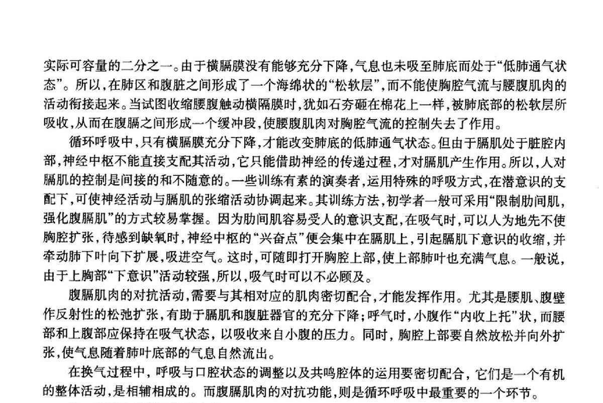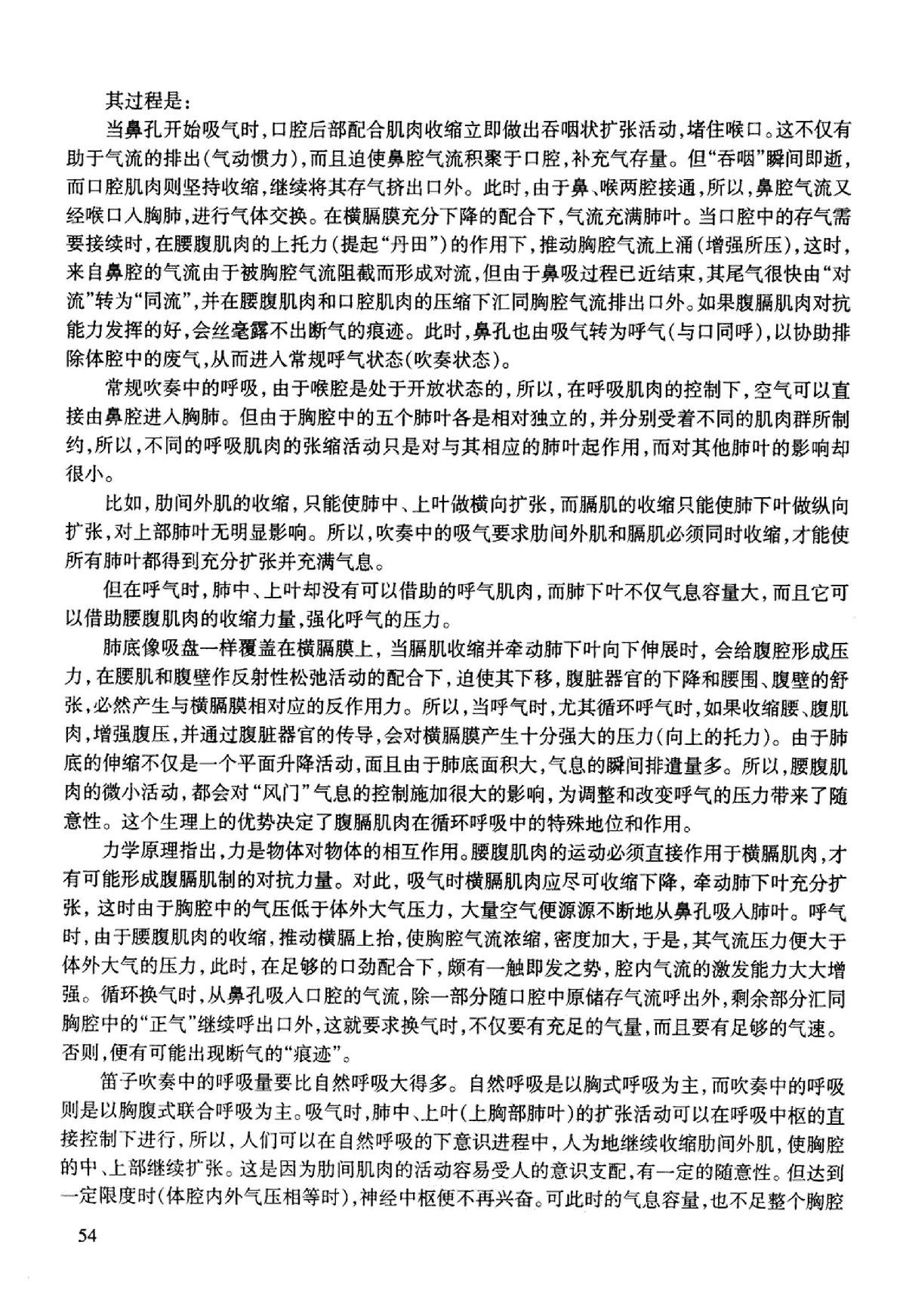 表面上看,人体任何部位的呼吸肌肉的收缩与舒张,似乎都能引起整个胸腔气流的变化,而构成腹肌与膈肌的直接对抗。其实,由于呼吸肌肉的收放作用实际上是吸而不呼,这种单方向性的肌肉活动就限定了胸腔中、上部的气息在吹奏中只能作为辅助性的动力,靠肺、胸部的回缩力,可以满足生理上气体交换的需要,但由它产生的气流压力作为能量去激发笛管腔的气柱振动,则显得过于弱小,作为循环换气时的气动惯力,更是不可能。因为胸腔没有呼气可以借助的任何肌肉,人为的用力反而会使吸气肌肉紧张,以至限制胸腔的回缩,抑制气流的呼出。