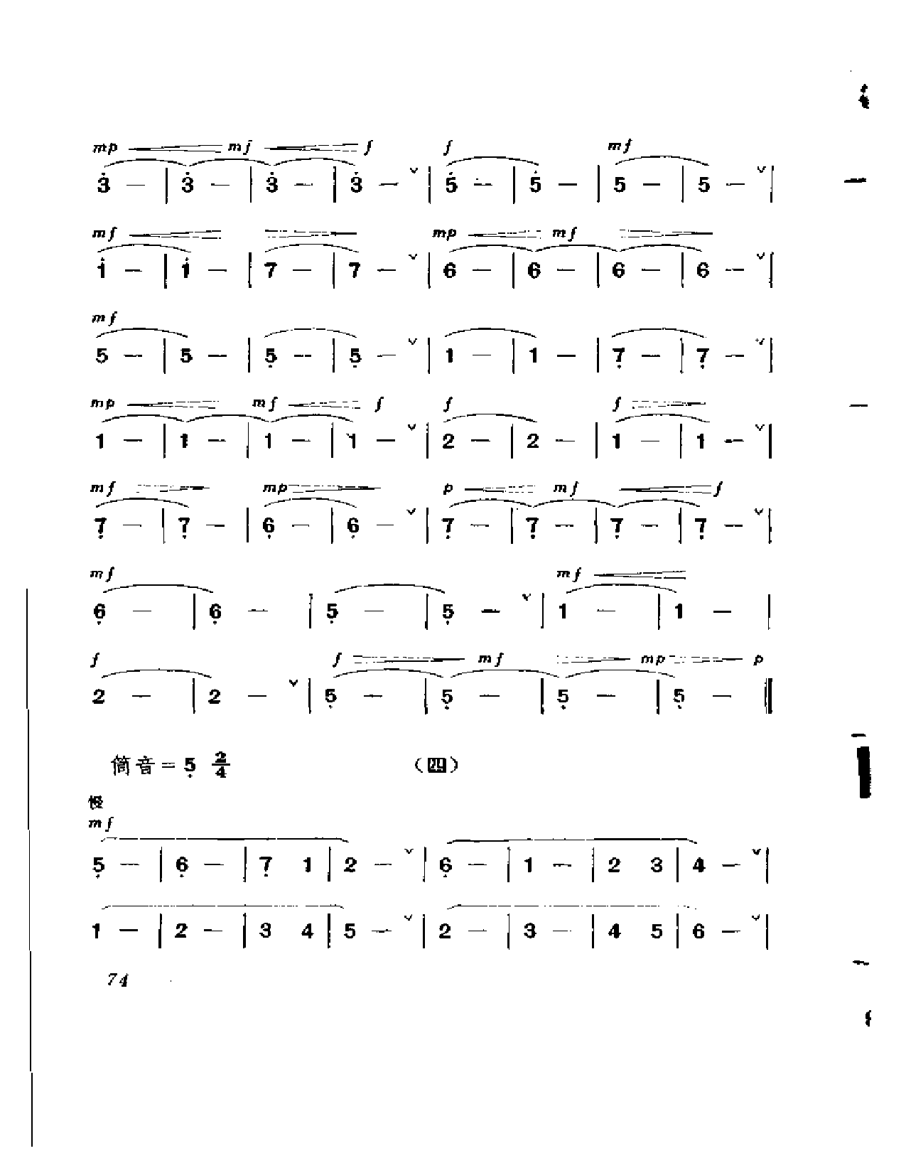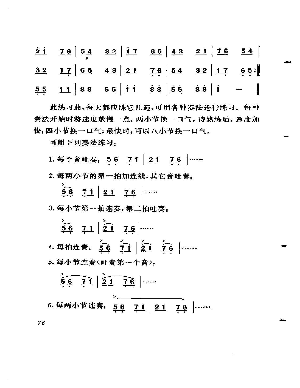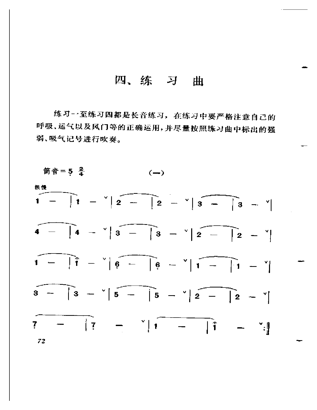 练习-至练习四都是长音练习,在练习中要严格注意自己的呼吸、运气以及风门等的正确运用,并尽量按照练习曲中标出的强弱、吸气记号进行吹奏。