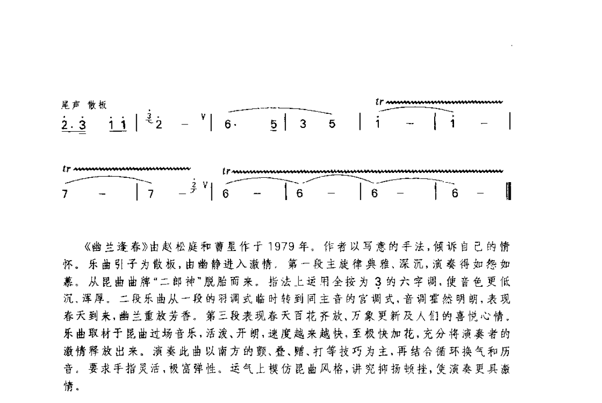 佚名 网络《幽兰逢春》由赵松庭和曹星作于1979年。作者以写意的手法﹐倾诉自己的情怀。乐曲引子为散板﹐由幽静进入激情.第一段主旋律典雅、深沉,演奏得如怨如慕。从昆曲曲牌“二.郎神”脱胎而来。指法上运用全按为3的六字调,使音色更低沉.浑厚。二段乐曲从一段的羽调式临时转到同主音的宫调式,音调霍然明朗,表现春天到来﹐幽兰重放芳香。第三段表现春天百花齐放、万象更新及人们的喜悦心情.乐曲取材于昆曲过场音乐,活泼、开朗v速度越来越快,至极快加花,充分将演奏者的激情释放出来。演奏此曲以南方的颤、叠、赠、打等技巧为主,再结合循环换气和历音。要求手指灵活﹐极富弹性。运气上模仿昆曲风格,讲究抑扬顿挫,使演奏更具振情。