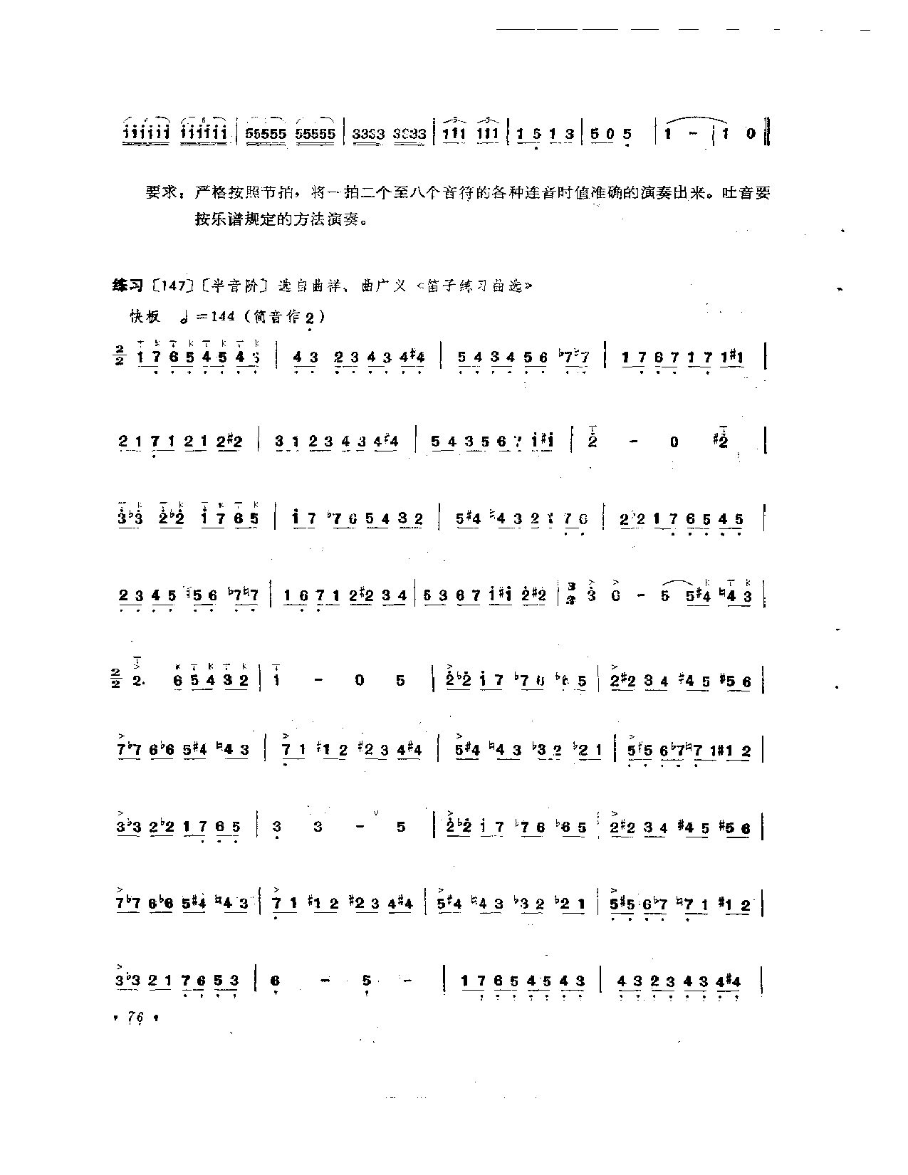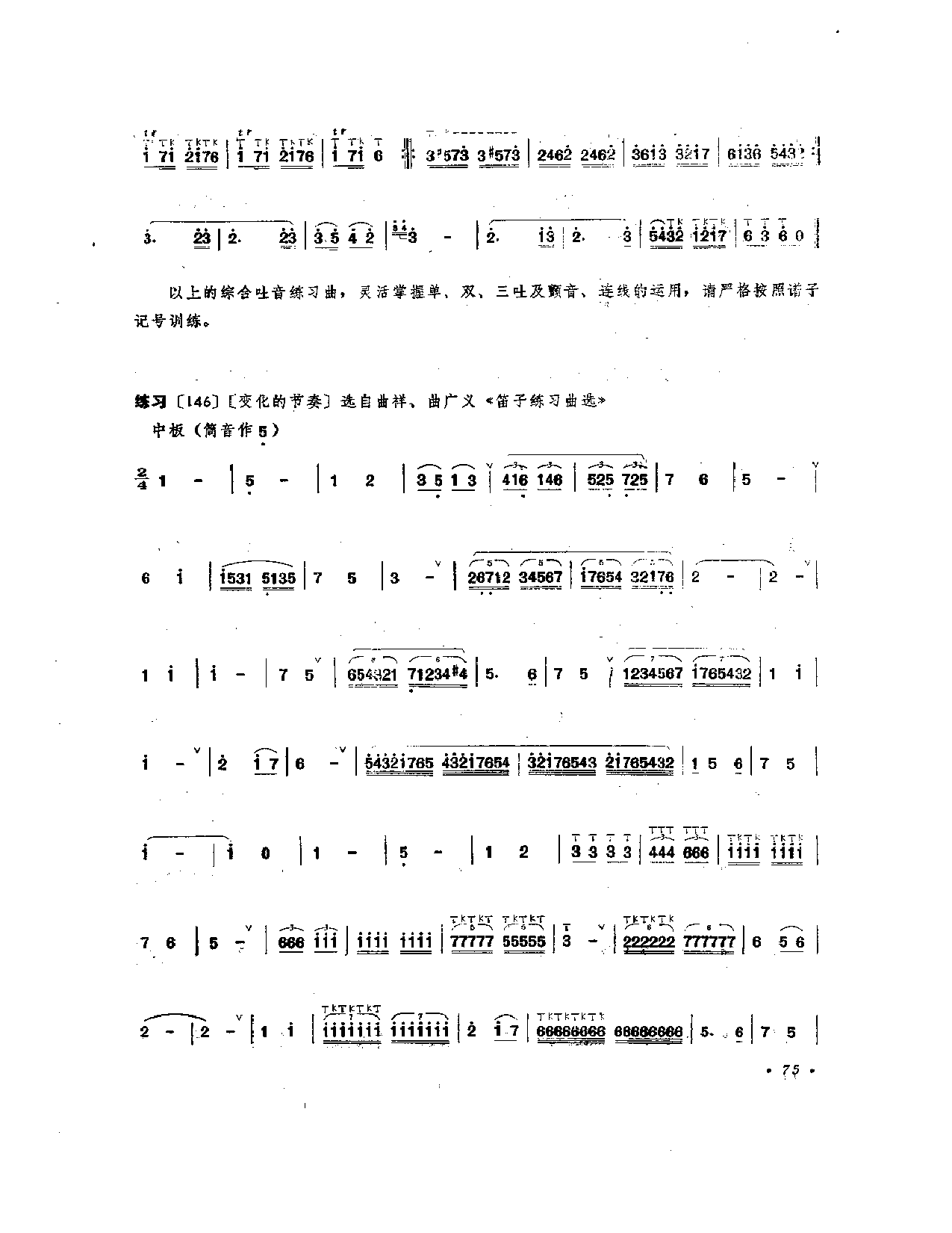 以上的综合吐音练习曲,灵活掌握单、双、三吐及颤音、连线的运用,请严格按照诺子记号训练。