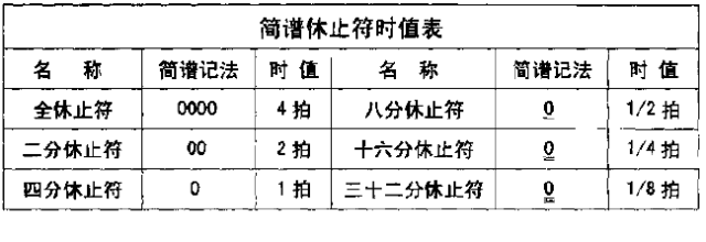 休止符停顿时间的长短与音符的时值基本相同,只是不用增时线,而用更多的 O来代替,每增加一个 O,表示增加一个相当于一个四分休止符的停顿时间,O越多,停顿的时间越长。