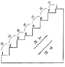 在音阶中,相邻两音之间的音高距离不是均等的,其中 3与 4、7与 i之间为半音关系,其余各相邻两音之间为全音关系。