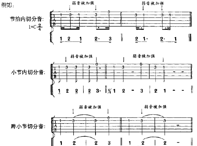 切分音的记法是在一小节或一拍之内记成一个音,跨小节的记成加连线的两个音。