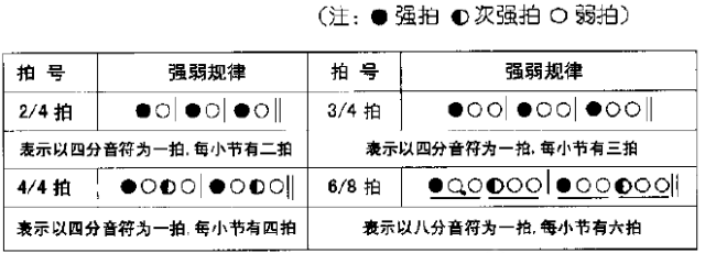 强拍用●表示,弱拍用○表示,次强拍用◎表示。