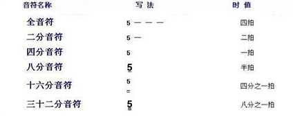常见的单纯音符的名称、写法及时值长短列表如下: