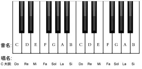 在键盘体系中,白键与黑键按固定规律排列,每个键均有固定的名称,用七个英文字母C、D、E、F、G、A、B表示音的名称,称为音名。