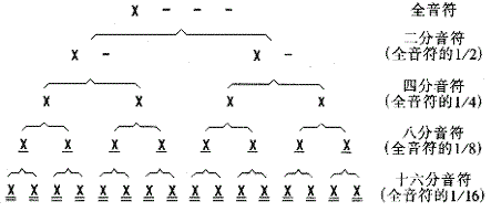 从上表可以看出,相邻两种音符之间的时值比例为2∶1。现将单纯音符之间的时值比例列表(如下图)