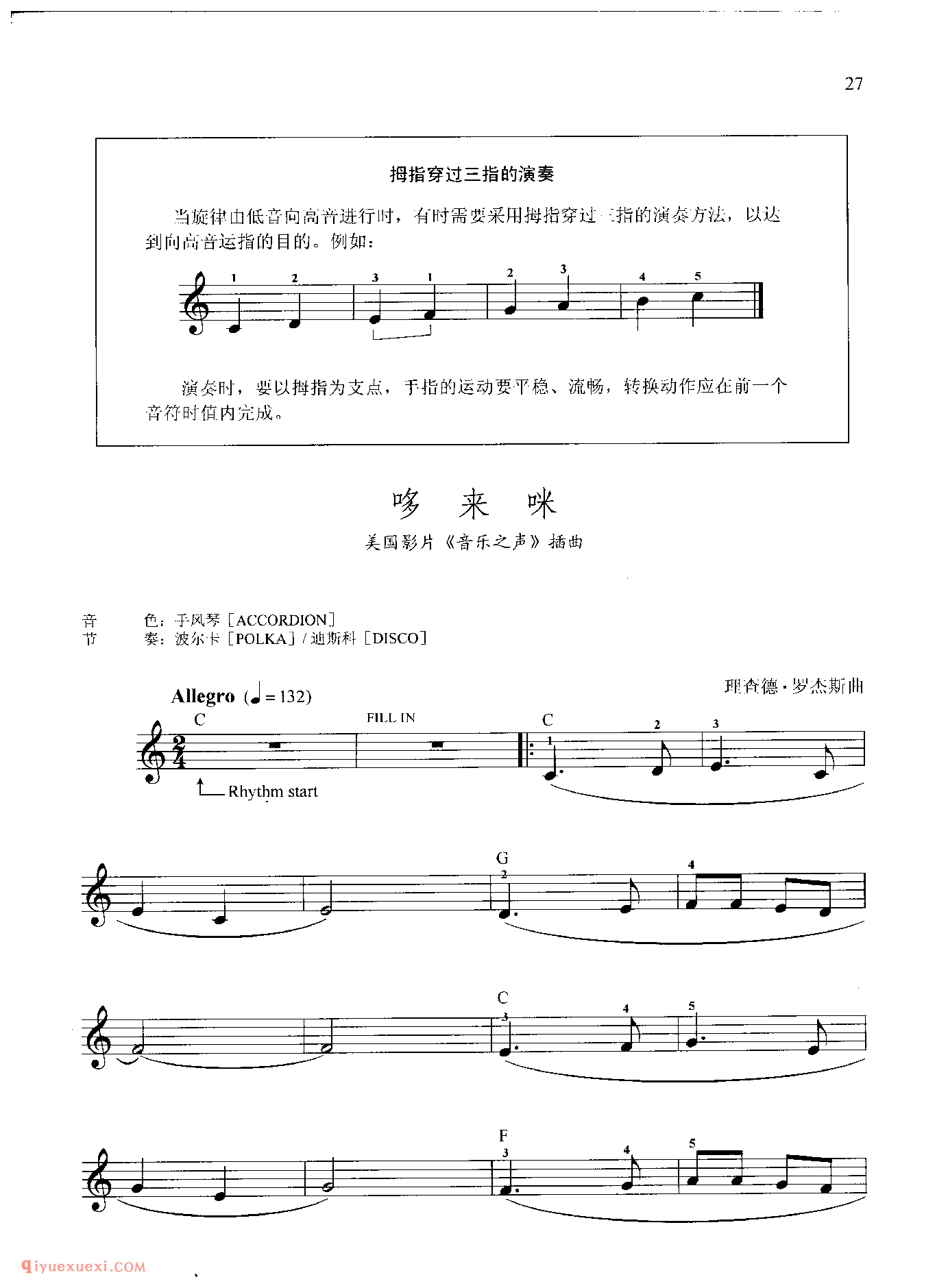 电子琴乐谱《哆来咪》拇指穿过三指的演奏