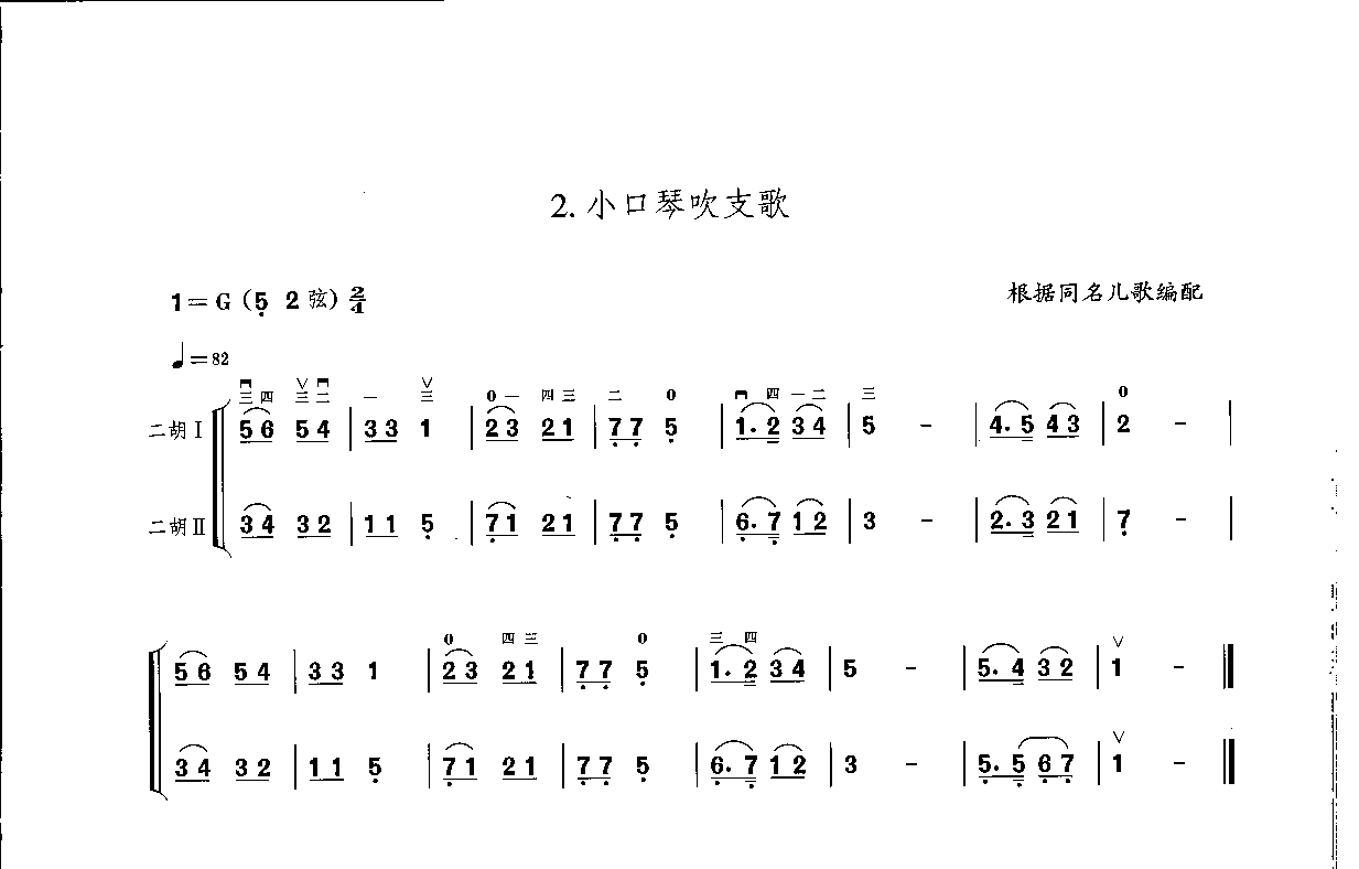 佚名 网络二胡重奏练习谱:小口琴吹支歌&根据同名儿歌编配