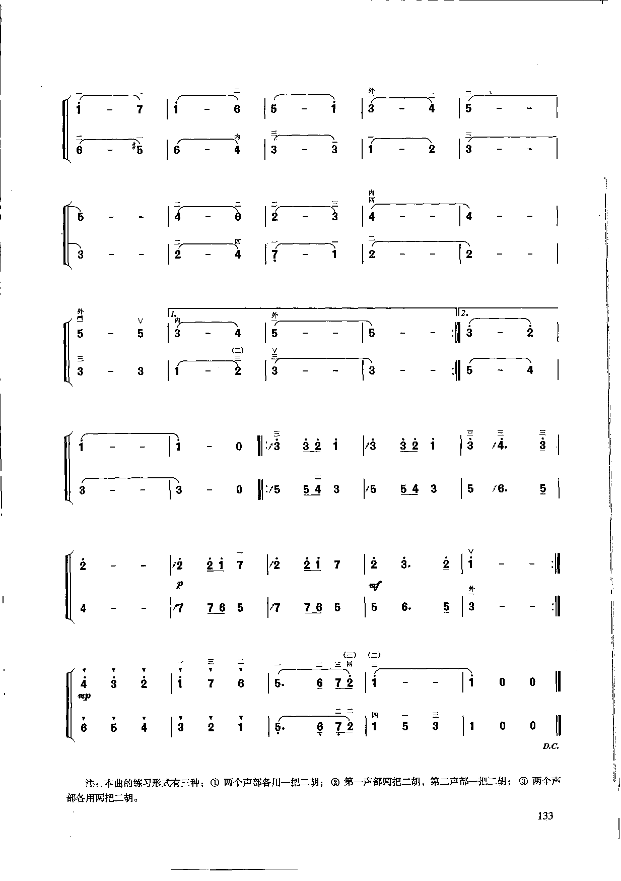 佚名 网络注:.本曲的练习形式有三种:两个声部各用一把二胡;②第一声部两把二胡,第二声部一把二胡;两个声部各用两把二胡。