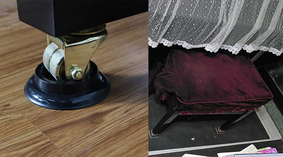 可看起来实在是不美观,而且因为减震垫有几厘米厚度,材质又软,所以钢琴刚开始放上去时不稳,生怕有人把钢琴碰倒了。但过了两周,钢琴的重量逐渐压了下来,算是四角站稳了。