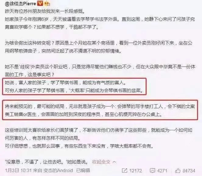 这位妈妈的想法虽然不能代表所有,但至少也是一部分家长的感觉。如果最终培养出来的孩子只能在班级联欢会,或者公司年会表演个节目的话,那么何必费尽心力去培养?孩子学会了钢琴,就真的能成人上人吗?这个恐怕也是一个大大的问号。
