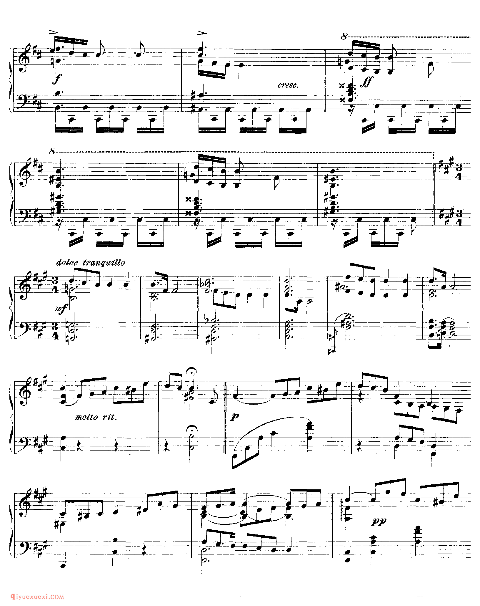 佚名 网络1、升f小调夜曲 Nocturne in f-Sharp Minor Op.5-1 是斯克里亚宾早期的代表作之一,为钢琴家们所喜爱,是一首很著名的钢琴小品。乐曲采用升f小调,三部曲式。第一段是行板,升f小调,甘美的主题如同肖邦风格,和声的对位处理非常优美巧妙。中段变为激动的快板,D大调。先出现的旋律是哀愁的,然后是热情洋溢的,左手的十六分音符带有好像是要抑制住哀愁一般的效果。最后是第一段的再现。