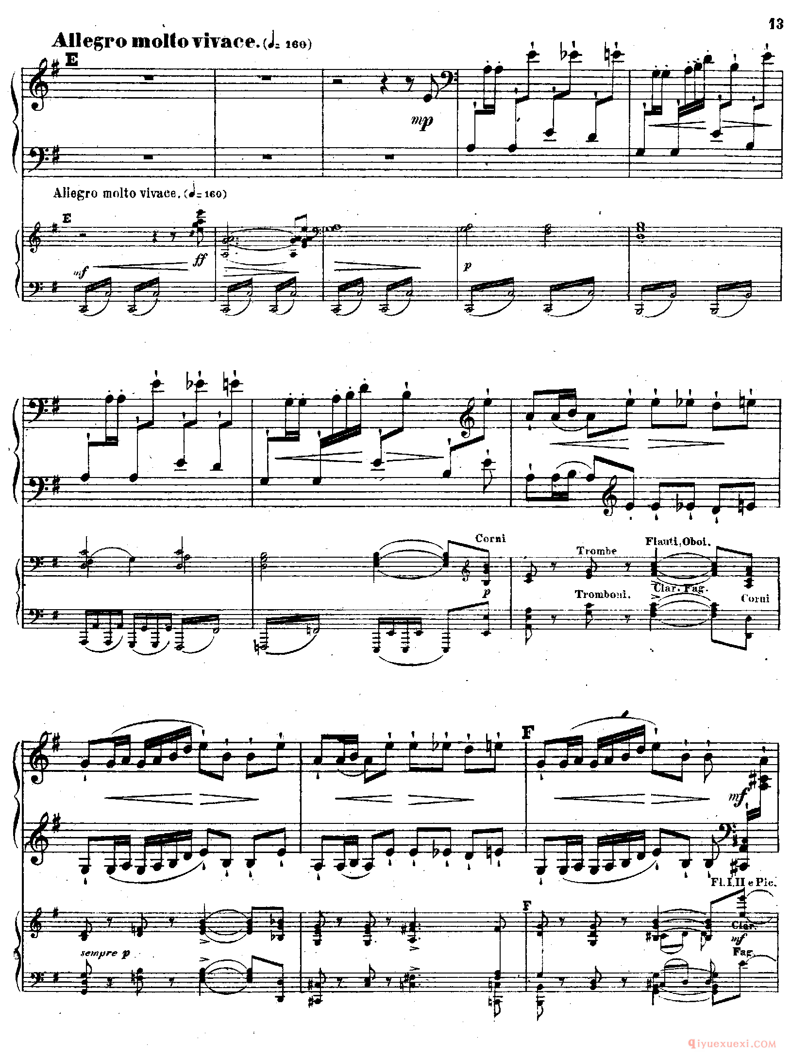 佚名 网络乐曲用灿烂的快板,降E大调,4/4拍,奏鸣曲式。一开始是大提琴与定音鼓喃喃的低语,随后大管奏出第一主题。如梦般的第二主题由钢琴在G大调呈示,之后是弦乐接奏出甘美的旋律。当钢琴奏出华彩之后,呈示部结束。展开部以第一主题的动机加入第二主题的要素,由各种管乐器轻快地演奏后,钢琴的律动使乐曲越加激昂。此后,弦乐对第一主题后半部分的乐思予以大幅度的展开,接着是长达87小节的华彩段。再现部中第一主题大幅度的变形并紧缩,不久转入降E大调,由弦乐再现第二主题。最后,音乐以强劲之势进入急板,形成华丽的结尾。