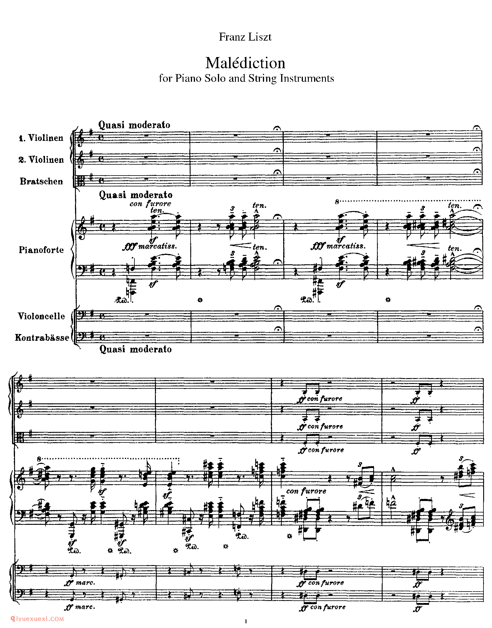 佚名 网络《诅咒》Malediction S.121 ,为钢琴与弦乐队而作,是李斯特早期的钢琴协奏作品之一,约作于1840年(一说是1833年)。这部作品是在他死后才被发表的,其手稿钢琴部分的开头标有 "Malediction" 字样,故取名为“诅咒”。作品为e小调开始,以E大调结束。内含六个基本动机,代表着六种不同的心情,随着心情的转变,动机改变。