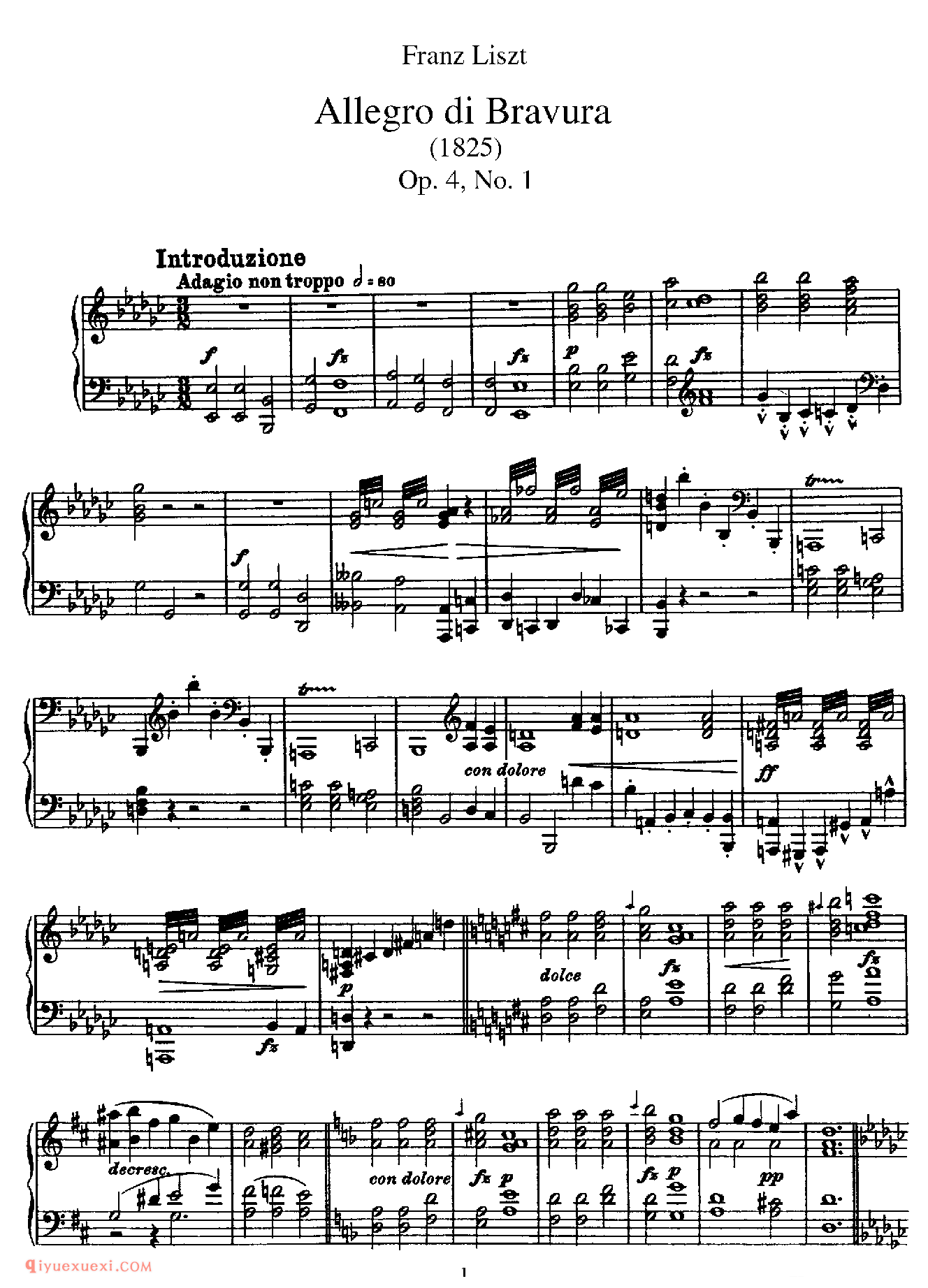 佚名 网络《华丽的快板》Allegro di Bravura S.151 ,作于1824年,题献给萨德斯·阿马德乌斯伯爵(Thaddeus Amadé)。于1825年出版,编号为 Op.4 No.1 。作品为降E大调,由降e小调不过分的柔板引子引出降E大调的甚快板主题。