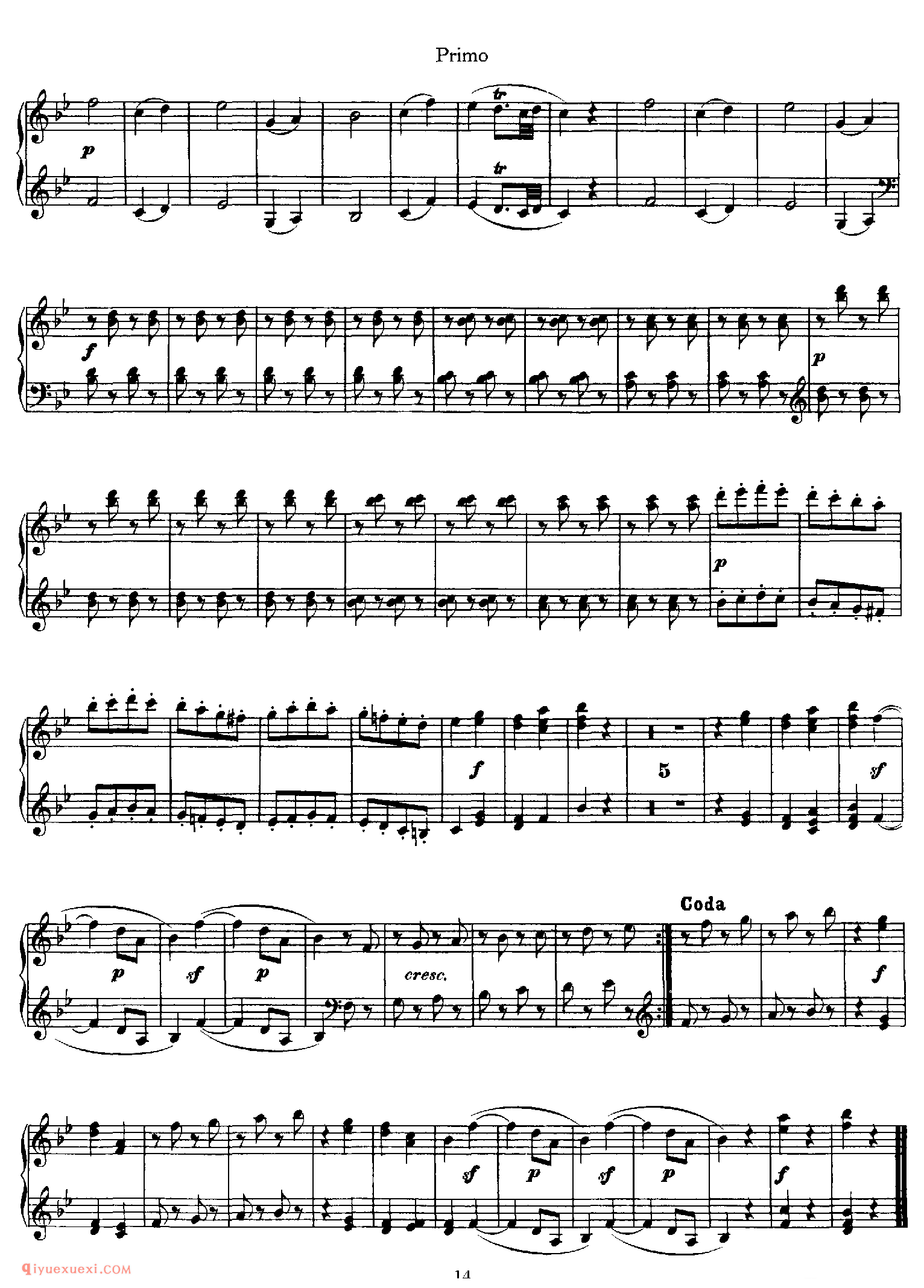 莫扎特 B大调奏鸣曲Sonata in Bb, K 358 (4 Hands)_四手联弹_莫扎特钢琴谱高清电子版乐谱歌词图片是器乐学习网于2021年11月30日 16:13:33更新分享的钢琴曲谱;资源收录于钢琴曲谱栏目中;器乐学习网免费分享莫扎特 B大调奏鸣曲Sonata in Bb, K 358 (4 Hands)_四手联弹_莫扎特钢琴谱简谱与五线谱歌谱图片,欢迎在线免费下载;器乐学习网无需注册会员,直接免费下载各类乐器学习资源及乐谱。