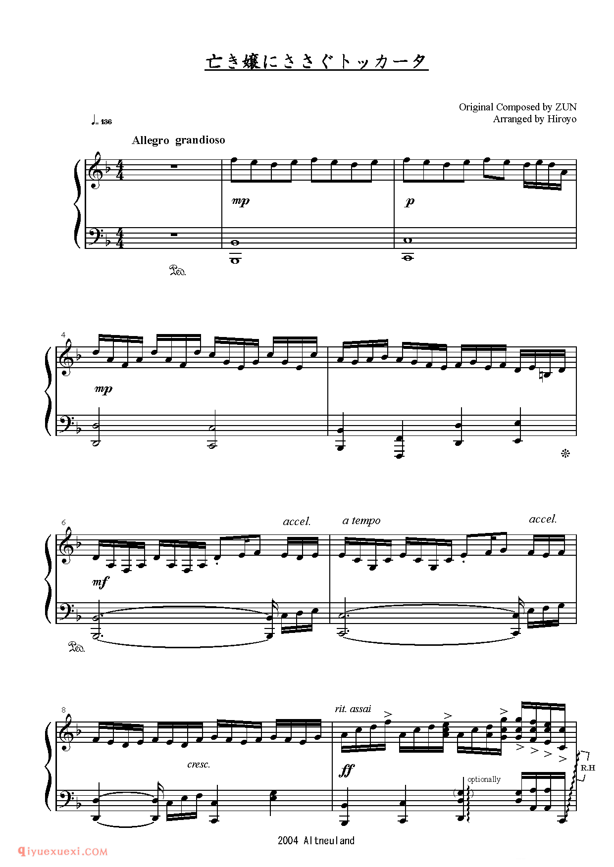 佚名 网络[Altneuland][lunatic][11]亡き嬢にささぐトッカータ_幽雅に咲かせ、墨染の桜~Border of Life_东方(project)钢琴谱高清电子版乐谱歌词图片是器乐学习网于2021年12月07日 09:45:28更新分享的钢琴曲谱;资源收录于钢琴曲谱栏目中;器乐学习网免费分享[Altneuland][lunatic][11]亡き嬢にささぐトッカータ_幽雅に咲かせ、墨染の桜~Border of Life_东方(project)钢琴谱简谱与五线谱歌谱图片,欢迎在线免费下载;器乐学习网无需注册会员,直接免费下载各类乐器学习资源及乐谱。