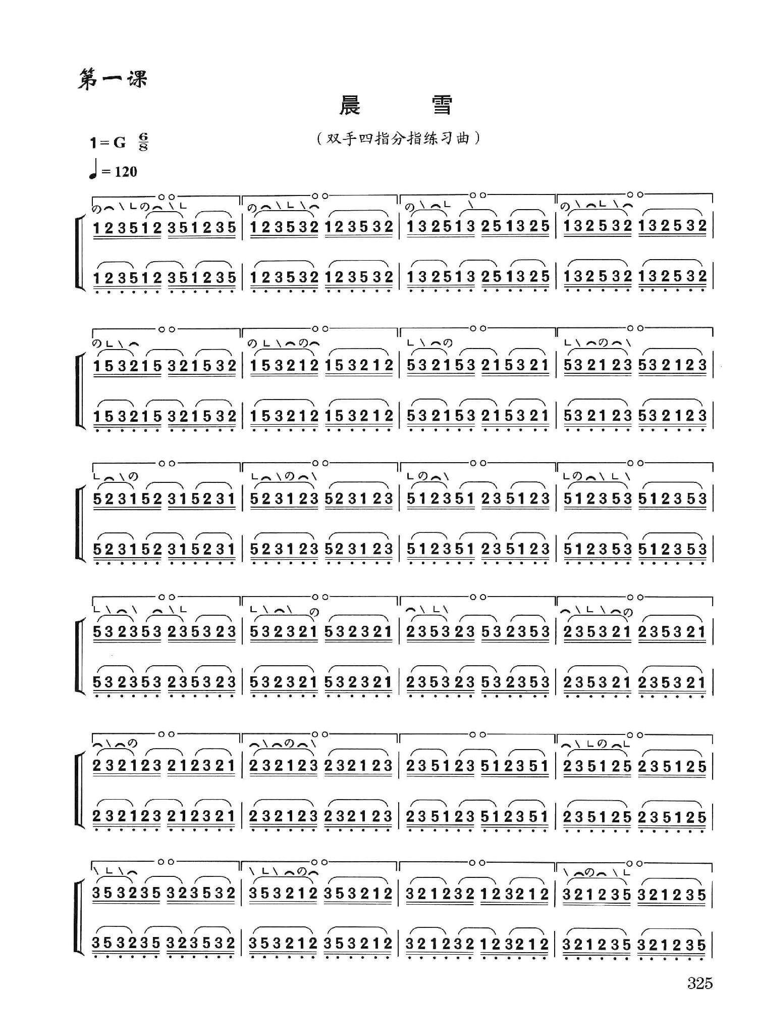 古筝双手四指分指练习曲《晨雪》高清电子版乐谱歌词图片是器乐学习网于2023年04月29日 11:18:12更新分享的古筝曲谱;资源收录于古筝曲谱栏目中;器乐学习网免费分享古筝双手四指分指练习曲《晨雪》简谱与五线谱歌谱图片,欢迎在线免费下载;器乐学习网无需注册会员,直接免费下载各类乐器学习资源及乐谱。