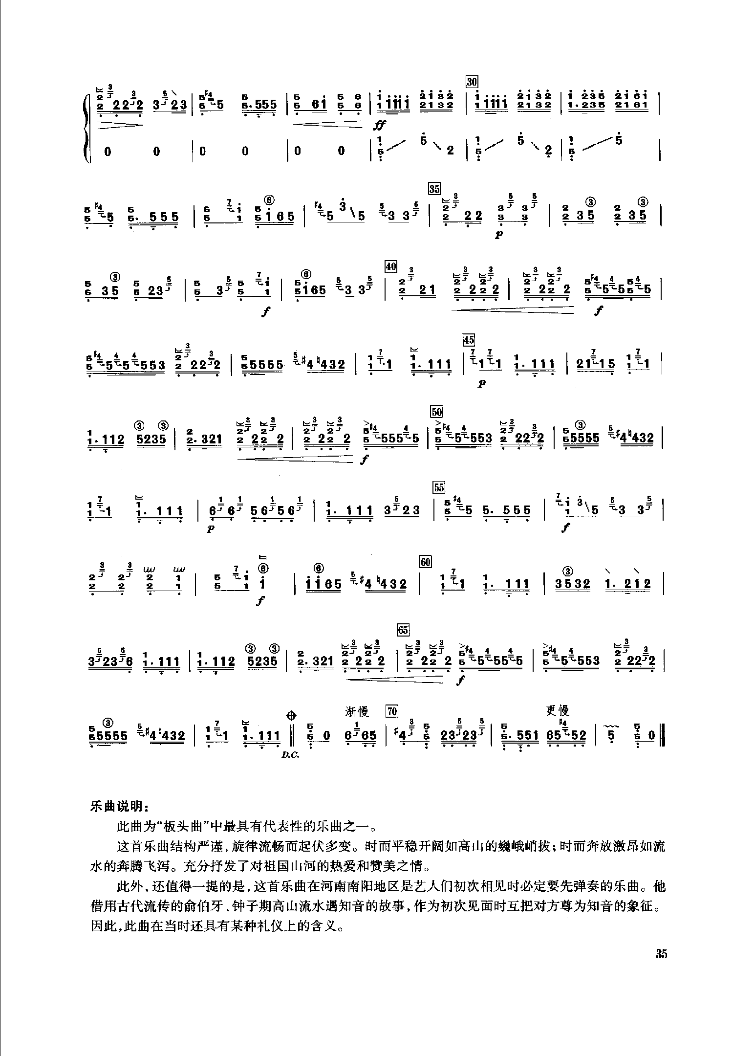 此外,还值得一提的是,这首乐曲在河南南阳地区是艺人们初次相见时必定要先弹奏的乐曲。他借用古代流传的俞伯牙.钟子期高山流水遇知音的故事,作为初次见面时互把对方尊为知音的象征。因此,此曲在当时还具有某种礼仪上的含义。