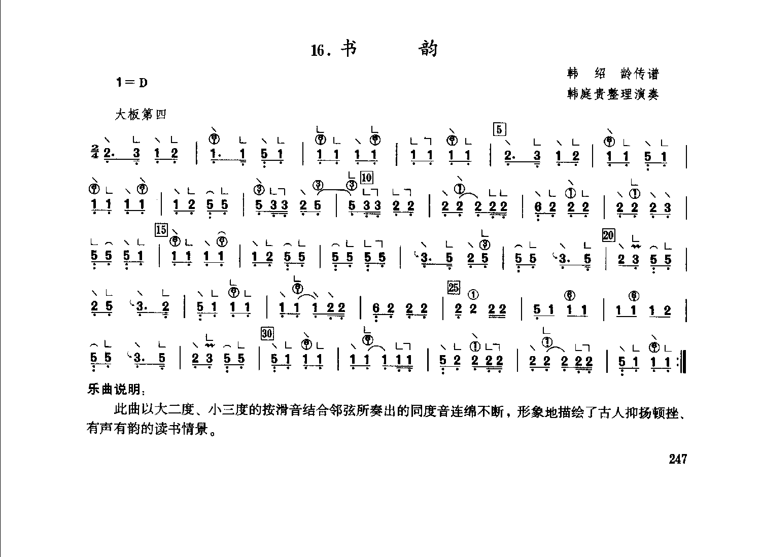 佚名 网络古曲[书韵]韩庭贵 | 山东传统古筝名曲谱,乐曲说明:此曲描绘了-一-幅轻风徐来、绿竹摇首的诗情画面。