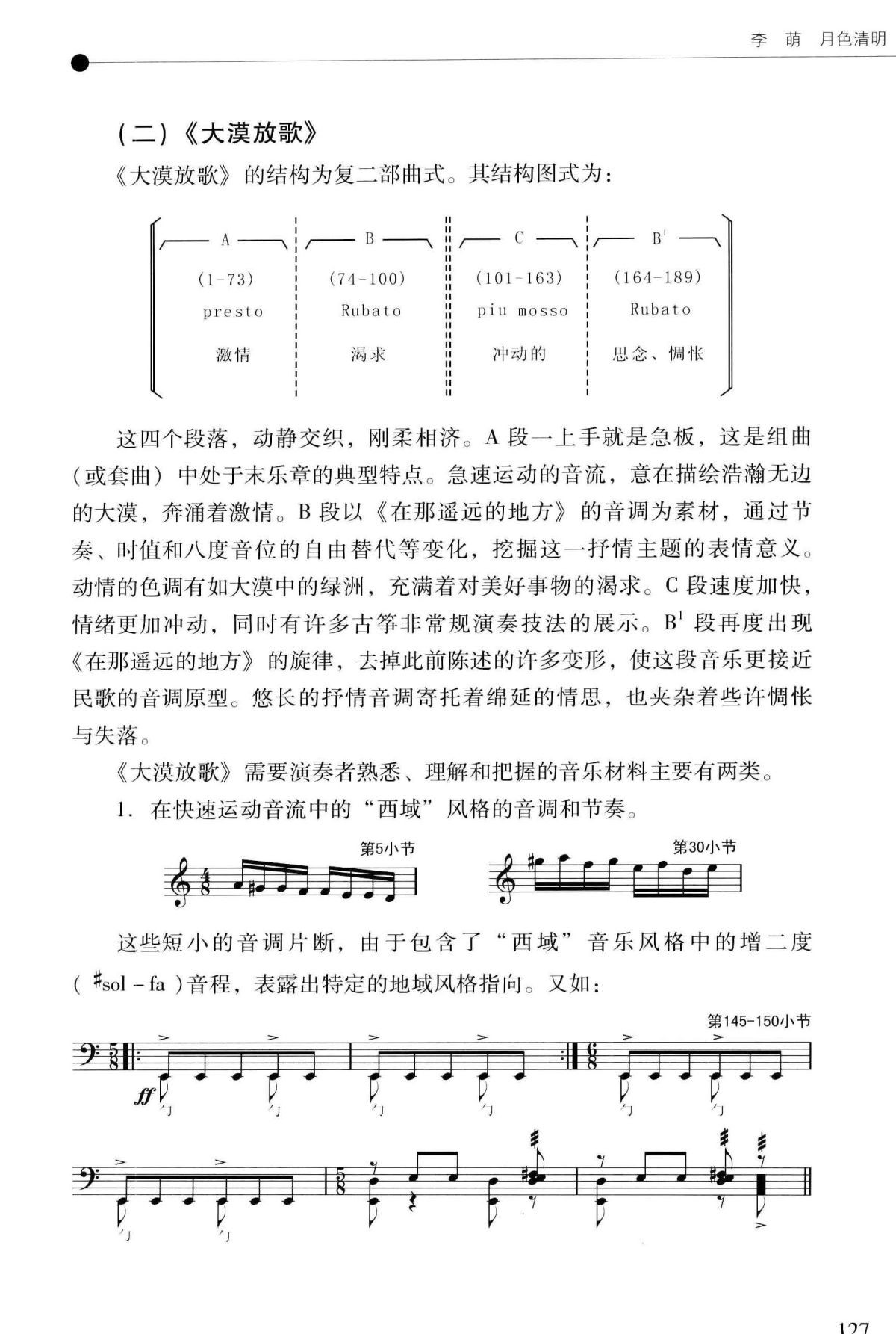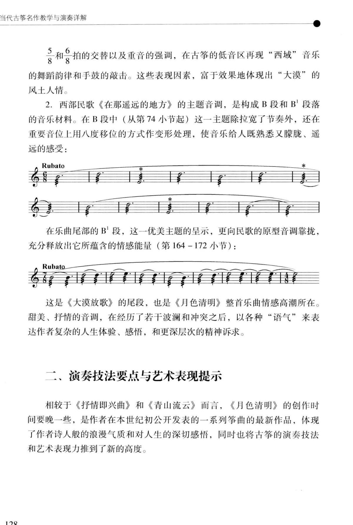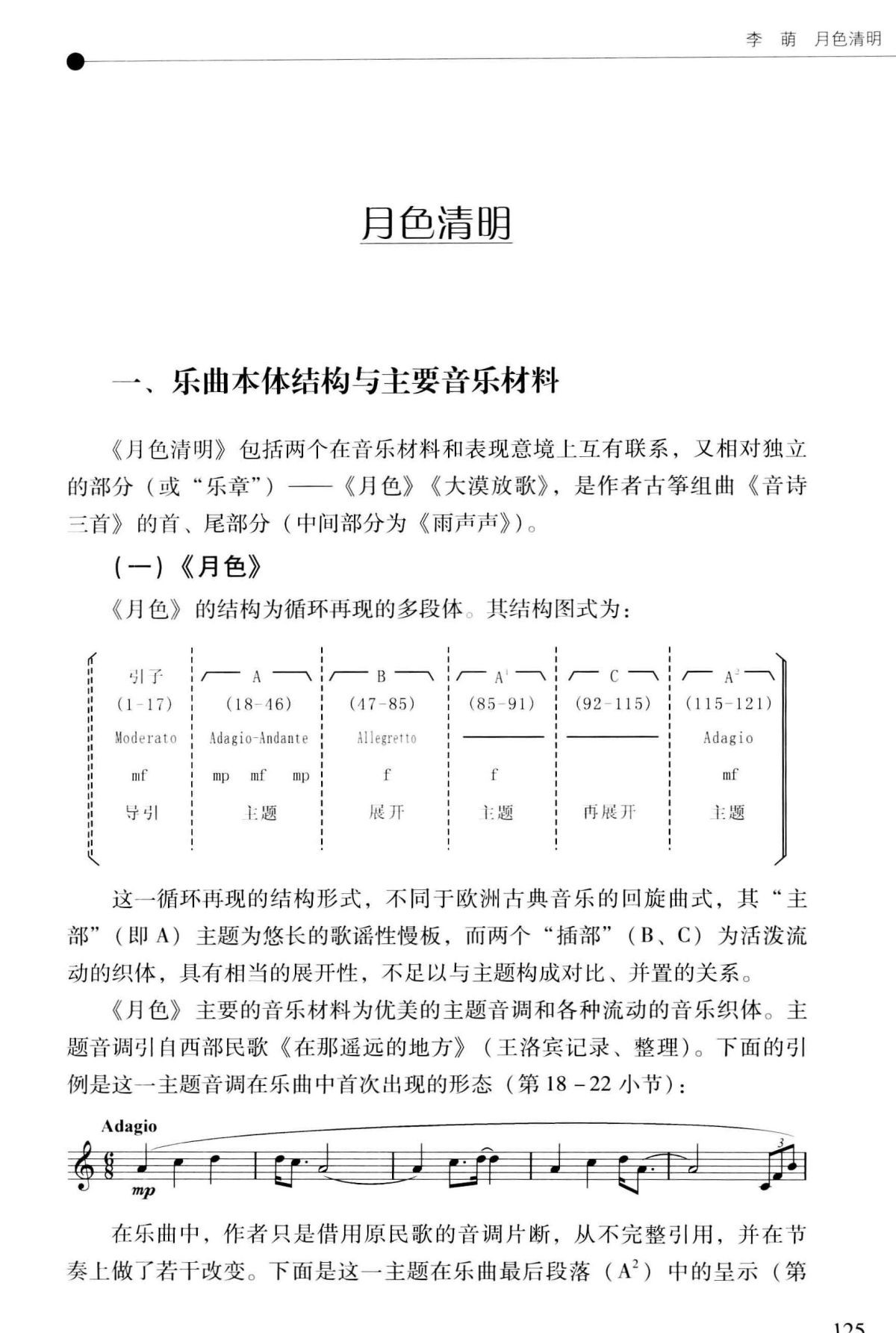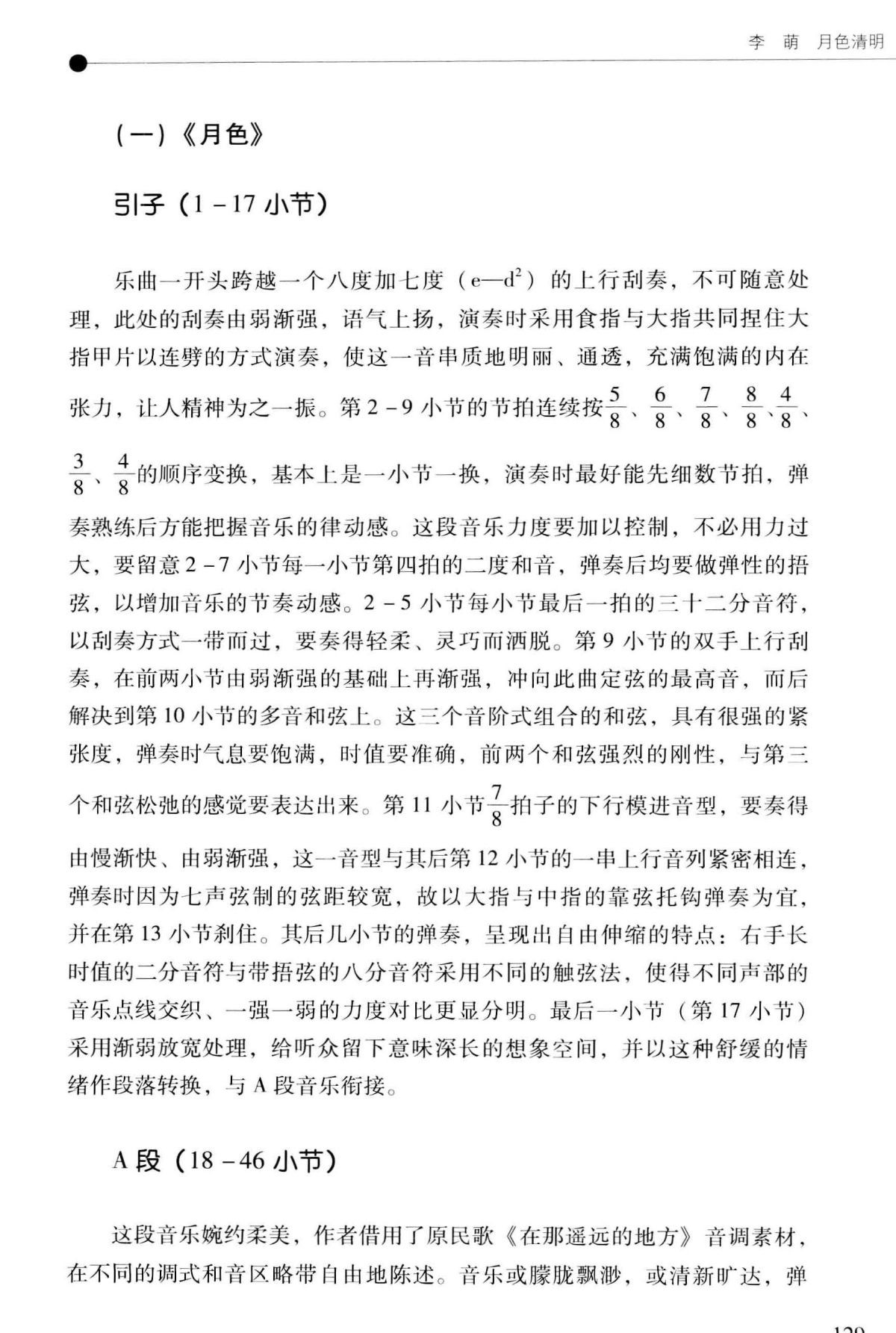 相较于《抒情即兴曲》和《青山流云》而言,《月色清明》的创作时间要晚一些,是作者在本世纪初公开发表的一系列筝曲的最新作品,体现了作者诗人般的浪漫气质和对人生的深切感悟,同时也将古筝的演奏技法和艺术表现力推到了新的高度。