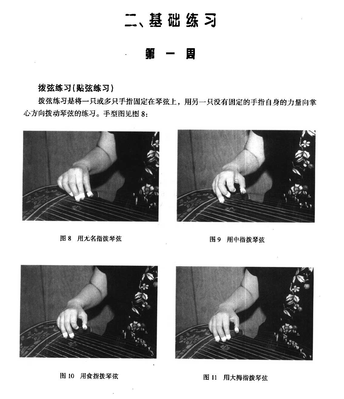 拨弦练习是将一只或多只手指固定在琴弦上,用另一只没有固定的手指自身的力量向掌心方向拨动琴弦的练习。手型图见图8: