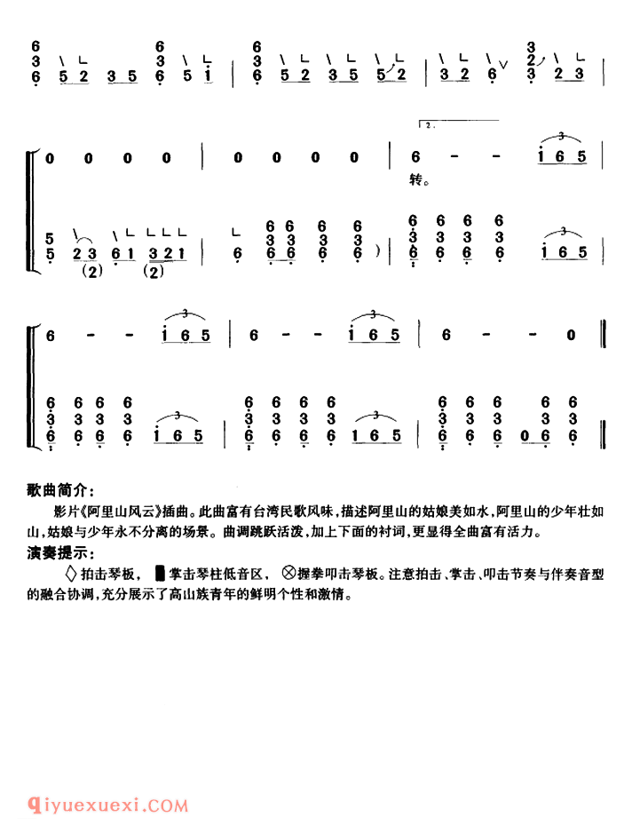 拍击琴板,掌击琴柱低音区,握拳叩击琴板。注意拍击.掌击.叩击节奏与伴奏音型的融合协调,充分展示了高山族青年的鲜明个性和激情。