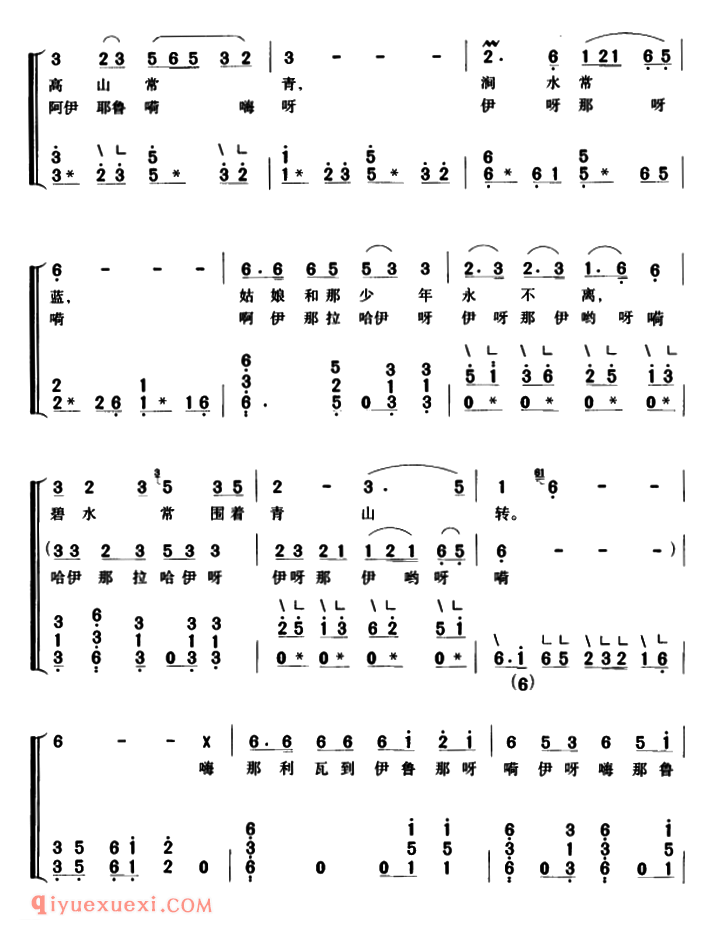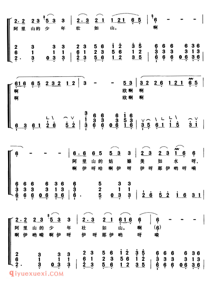 影片《阿里山风云》插曲。此曲富有台湾民歌风味,描述阿里山的姑娘美如水,阿里山的少年壮如山,姑娘与少年永不分离的场景。曲调跳跃活泼,加上下面的衬词,更显得全曲富有活力。