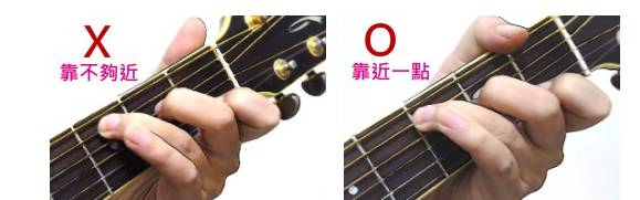 这是很多初学常犯的错误,要记得手指要尽量靠近琴衍(Fretwire,我们俗称的品丝),这是压弦最省力的方式。如果手指按在中间也不太好,靠左边也容易「压不紧」而发出「滋...」的杂音。例如:C 和弦
