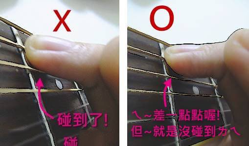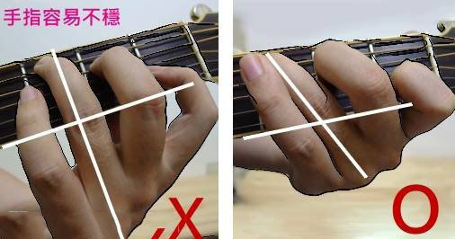 如上图所示,只要以不会碰触到其他弦为原则即可,没有一定要每根手指都 90度垂直于指板,有些和弦不一定需要这样。若是指尖的肉比较厚的人 (1)可能初期会比较辛苦一点,这时手指就要尽量翘起,指肉不要碰触到下方的弦,多加练习不同的角度跟位置,找出不会碰到其他弦的姿势,放开之后再重压,反覆练习,习惯之后就不会一直碰到其他弦了。