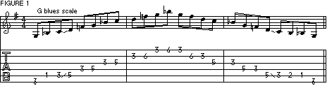 我现在想介绍我演奏时使用的两种具体的音阶模式。我们在第一个月里将复习第一条音阶。这就是blues音阶。大调blues音阶含有根音,降三音(blues里面不可或缺的音符之一),四音,降五音(另一个经典的blues音),五音,降七音。这的确是blues solo的基础。 FIGURE 1向你们展示了我是如何排指的。注意我上行时,我用无名指滑音演奏使我能迅速从第一把位上升到第三把位演奏。同时注意我喜欢在下行时使用降五音。