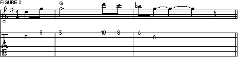 当我演奏乐句的时候,我的耳朵只有在我处理了这些音符后才会满意。这就需要加入颤音,推弦或滑弦。让我来给你们举个例子。 FIGURE 2展现了一条blues音阶构成的句子。