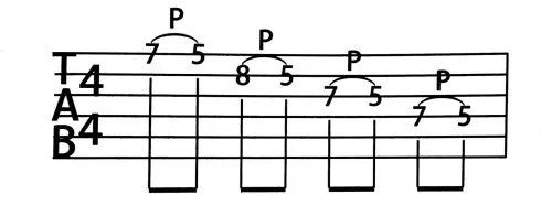 勾弦在只能是由高音向低音做下行弹奏,以下图第一个勾弦为例,左手无名指按住一弦的7品,左手的食指按一弦的5品,右手弹响一弦后,左手按住一弦7品的无名指迅速向掌心方向勾弦后,顺势离开,左手的食指还在按在一弦的5品上,此时琴弦震动发出的音就是勾弦音啦。