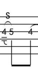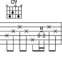 击弦的符号是H。弹奏时,如上图中先用中指无名指小拇指按好一个C9和弦,然后在弹到五弦的时候无名指抬起,弹响四弦,然后无名指再按下去,值得注意的是击弦和勾弦通常会一起用。