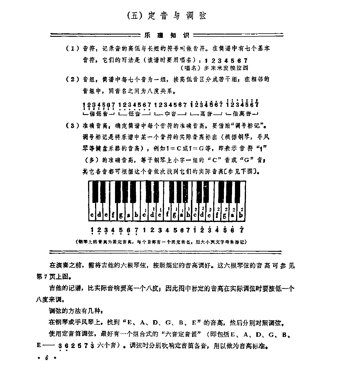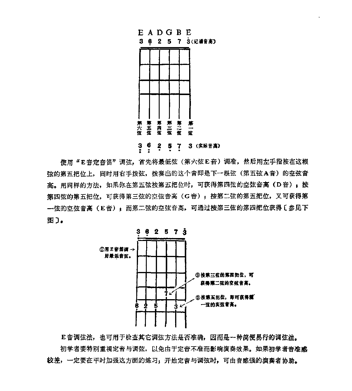在演奏之前,需将吉他的六根琴弦,按照规定的音高调好。这六根琴弦的音高可参见第﹖页上图。