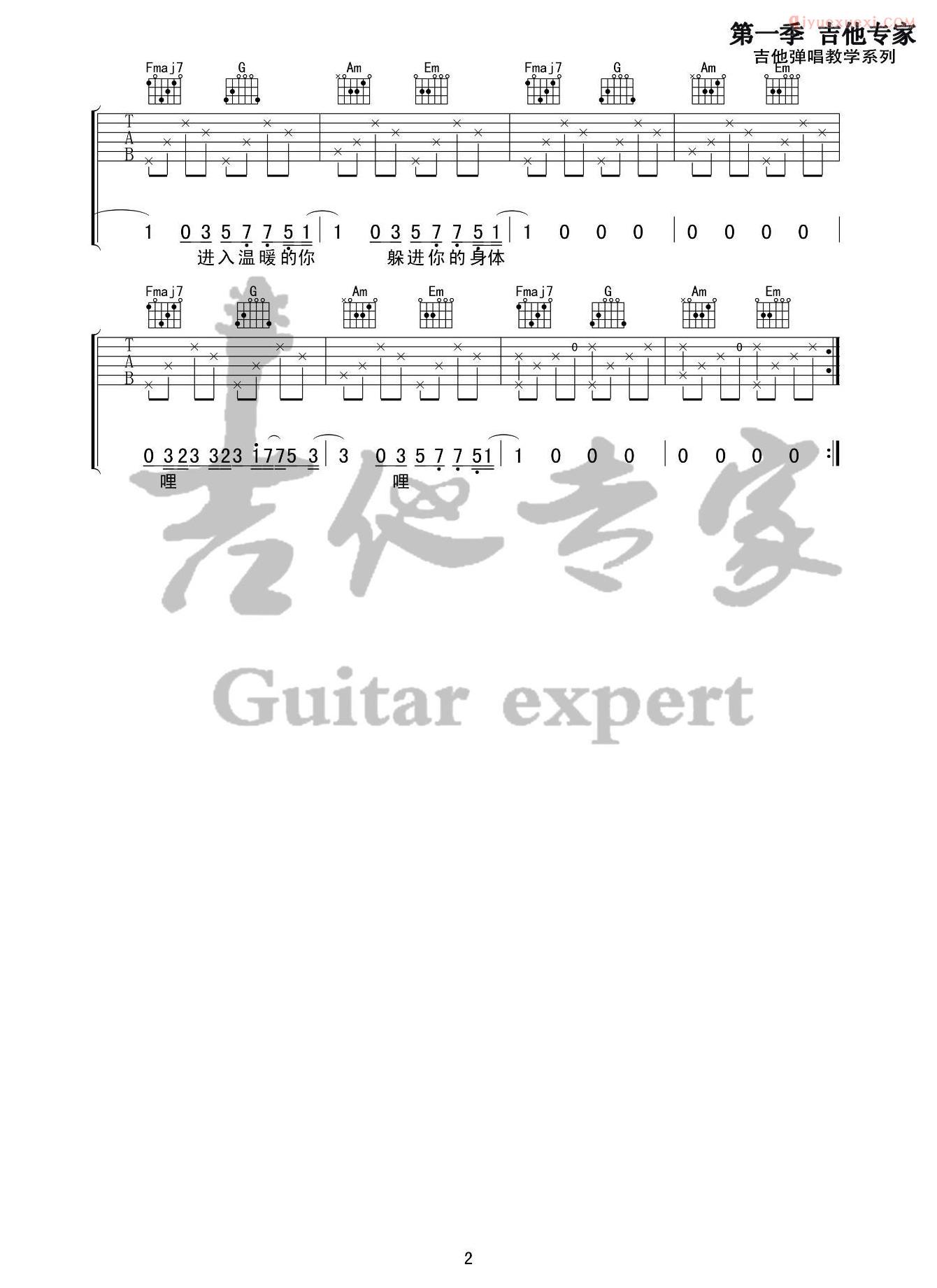 佚名 网络这首歌网络上有几个版本的翻唱,缥缈又空灵的电音给这首歌增彩了不少。这里是根据李佩琪的演唱版本编配的溯吉他谱,来自吉他专家编配分享。歌曲的原调F调,演唱变调夹夹第五品用C调指法,歌曲唱起来有点难,但和声进行还是挺简单的,喜欢的朋友不妨来试试吧。