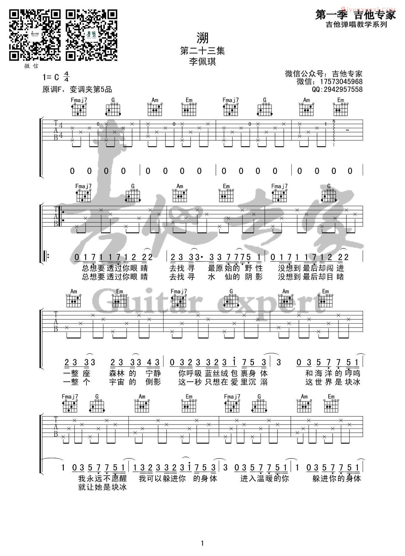 这首歌网络上有几个版本的翻唱,缥缈又空灵的电音给这首歌增彩了不少。这里是根据李佩琪的演唱版本编配的溯吉他谱,来自吉他专家编配分享。歌曲的原调F调,演唱变调夹夹第五品用C调指法,歌曲唱起来有点难,但和声进行还是挺简单的,喜欢的朋友不妨来试试吧。