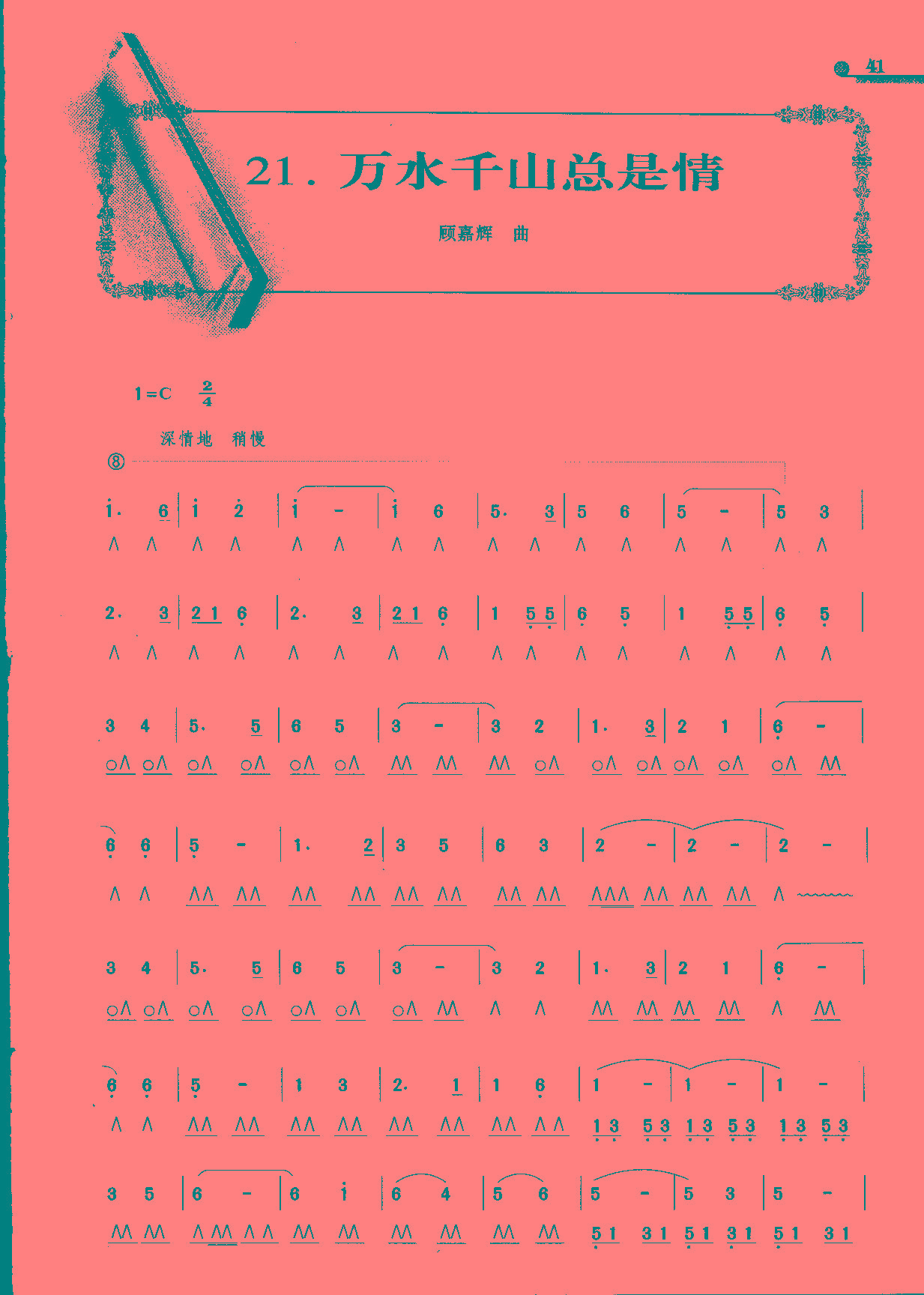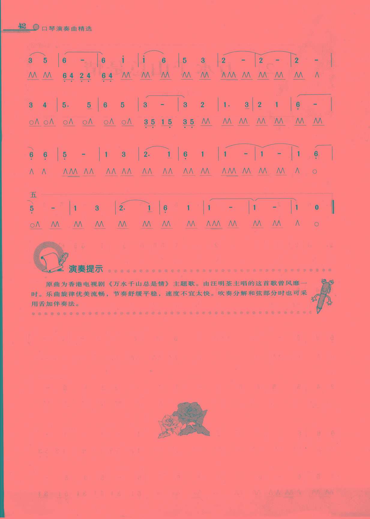 佚名 网络原曲为香港电视剧《万水千山总是情》主题歌。由汪明荃主唱的这首歌曾风靡一时。乐曲旋律优美流畅,节奏舒缓平稳,速度不宜太快。吹奏分解和弦部分时也可采用舌加伴奏法。
