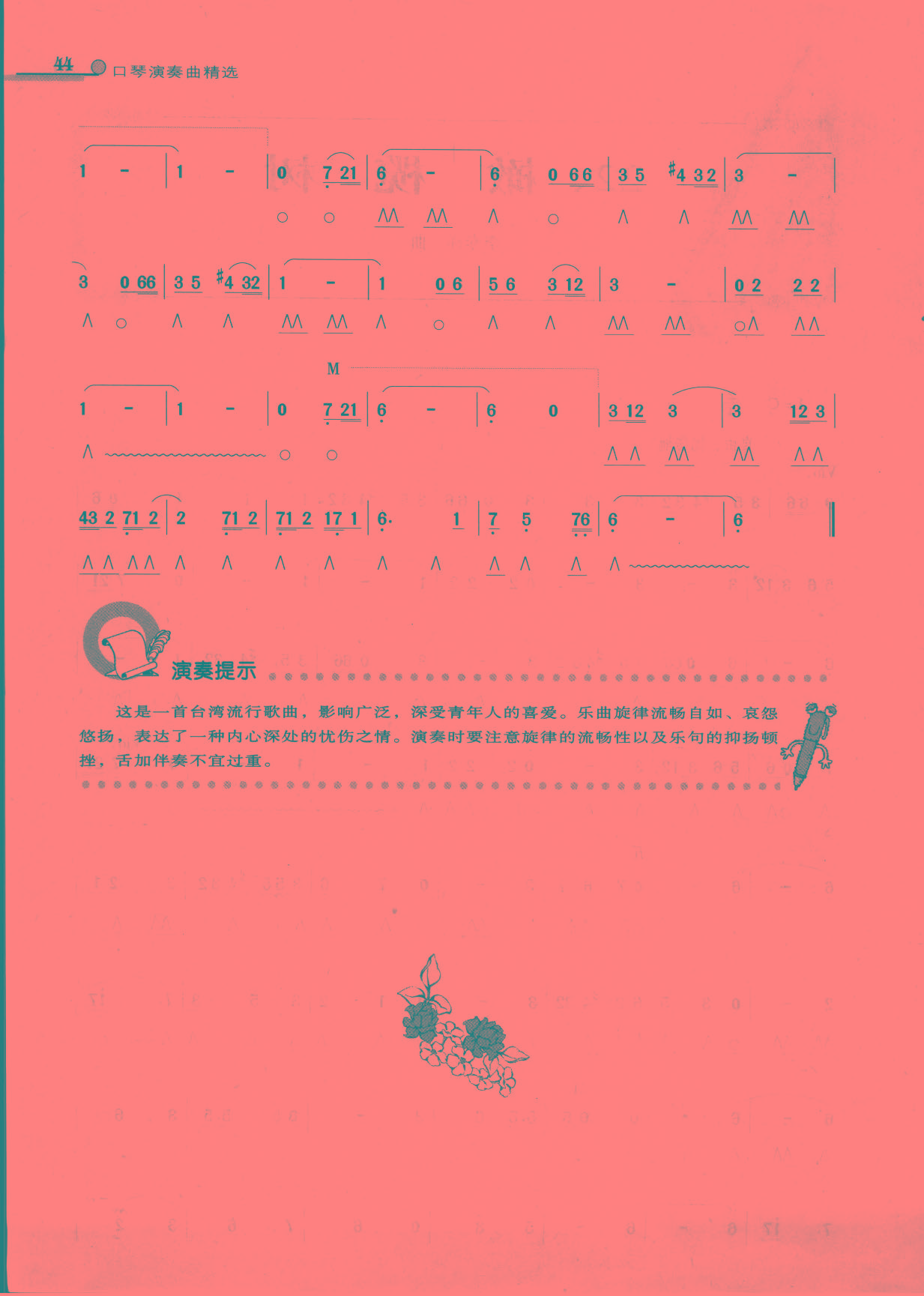 佚名 网络这是一首台湾流行歌曲,影响广泛,深受青年人的喜爱。乐曲旋律流畅自如、哀怨悠扬,表达了一种内心深处的忧伤之情。演奏时要注意旋律的流畅性以及乐句的抑扬顿挫,舌加伴奏不宜过重。