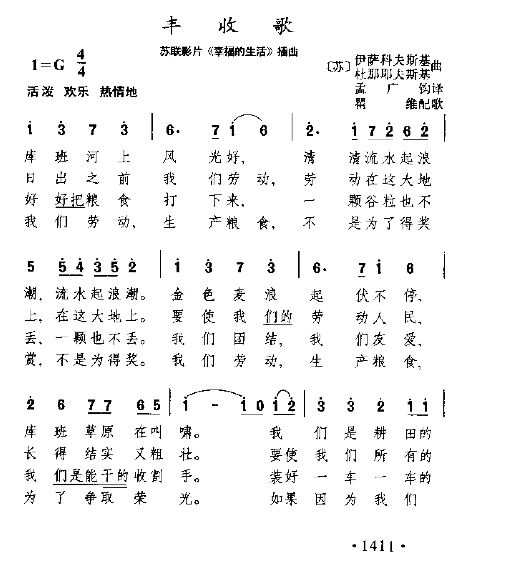丰收歌(苏联影片《幸福的生活》插曲)(苏)杜那耶夫斯基曲高清简谱歌词是器乐学习网于2025年02月08日 20:18:35更新分享的歌曲简谱;资源收录于歌曲简谱栏目中;器乐学习网免费分享丰收歌(苏联影片《幸福的生活》插曲)(苏)杜那耶夫斯基曲简谱与五线谱歌谱图片,欢迎在线免费下载;器乐学习网无需注册会员,直接免费下载各类乐器学习资源及乐谱。