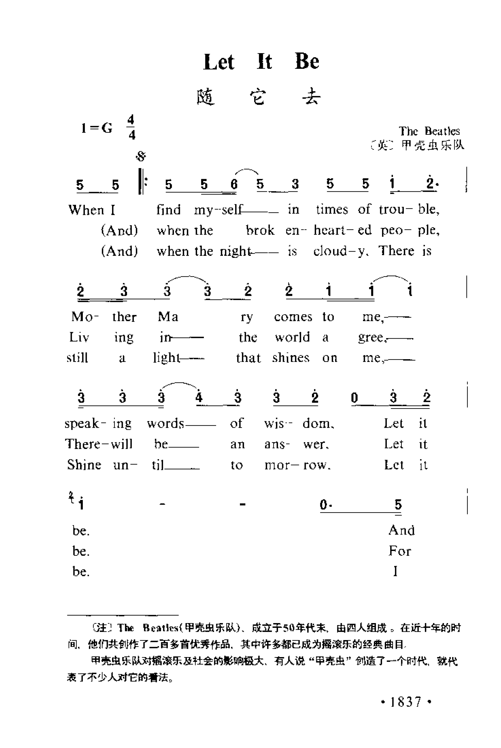 随它去(英)甲壳虫乐队高清简谱歌词是器乐学习网于2025年02月10日 16:07:52更新分享的外国歌谱;资源收录于外国歌谱栏目中;器乐学习网免费分享随它去(英)甲壳虫乐队简谱与五线谱歌谱图片,欢迎在线免费下载;器乐学习网无需注册会员,直接免费下载各类乐器学习资源及乐谱。
