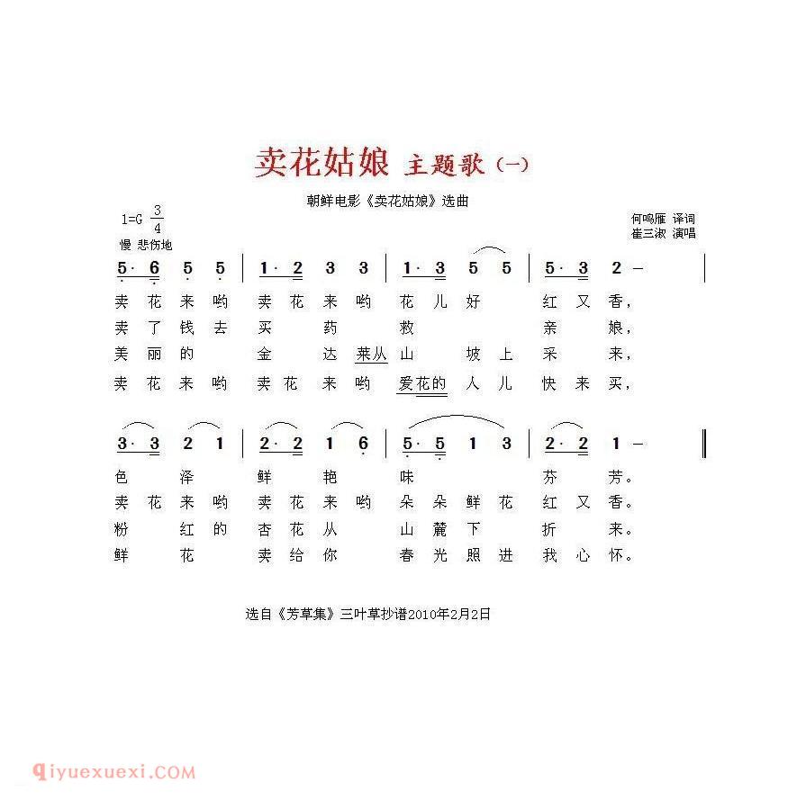 卖花姑娘/同名电影主题曲 | 朝鲜高清简谱歌词是器乐学习网于2021年07月17日 16:52:07更新分享的外国歌谱;资源收录于外国歌谱栏目中;器乐学习网免费分享卖花姑娘/同名电影主题曲 | 朝鲜简谱与五线谱歌谱图片,欢迎在线免费下载;器乐学习网无需注册会员,直接免费下载各类乐器学习资源及乐谱。