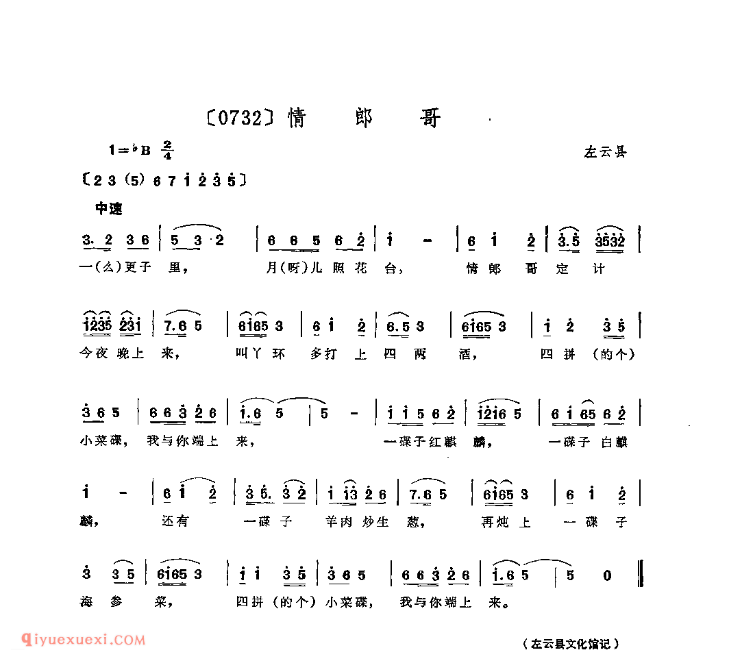 情郎哥&左云县_小调类_山西民间歌曲简谱高清简谱歌词是器乐学习网于2022年09月14日 11:04:30更新分享的民歌曲谱;资源收录于民歌曲谱栏目中;器乐学习网免费分享情郎哥&左云县_小调类_山西民间歌曲简谱简谱与五线谱歌谱图片,欢迎在线免费下载;器乐学习网无需注册会员,直接免费下载各类乐器学习资源及乐谱。