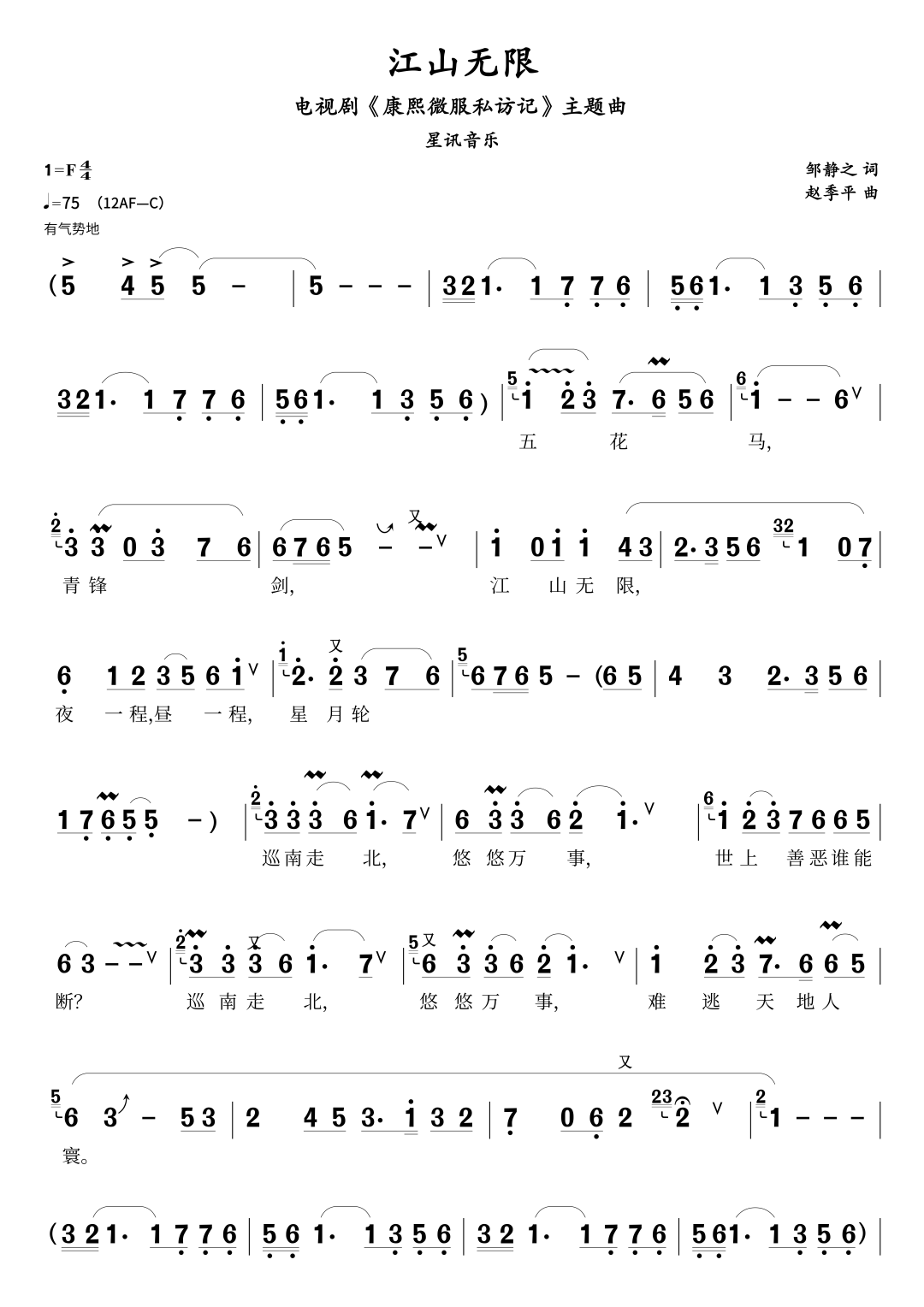 《江山无限》陶笛曲谱高清电子版乐谱歌词图片是器乐学习网于2024年07月02日 15:24:57更新分享的陶笛曲谱;资源收录于陶笛曲谱栏目中;器乐学习网免费分享《江山无限》陶笛曲谱简谱与五线谱歌谱图片,欢迎在线免费下载;器乐学习网无需注册会员,直接免费下载各类乐器学习资源及乐谱。